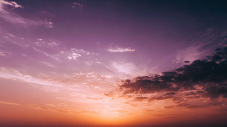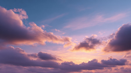A breathtaking view of a sunset sky filled with soft clouds and vibrant colors, capturing the tranquil beauty of nature during twilight hours.