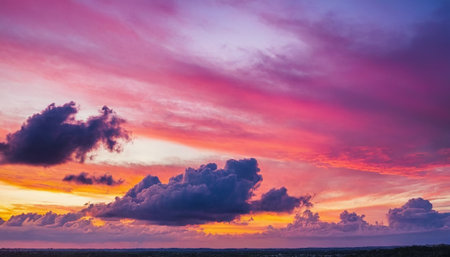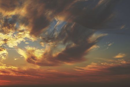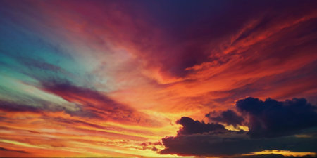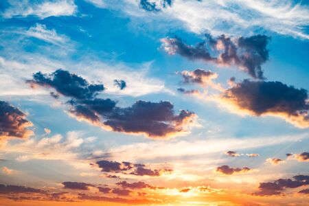 Beautiful vibrant sunset sky with clouds of different tiers and the height of various shades backlit by sunlight