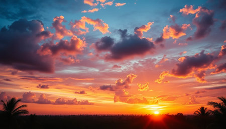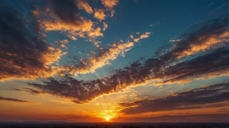 Vibrant sunset with dramatic clouds and sunbeams on horizon.