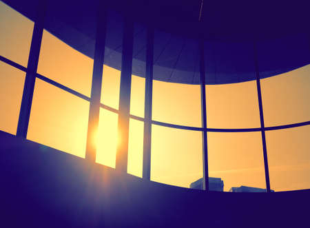 Modern office architectural building with glass window reflected with orange sunlight. Corporate building financial skyscraper office building construction with evening sky with orange sun ray. AIG42.