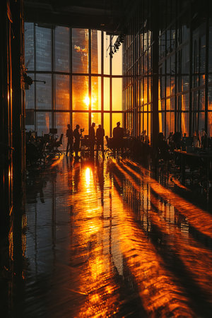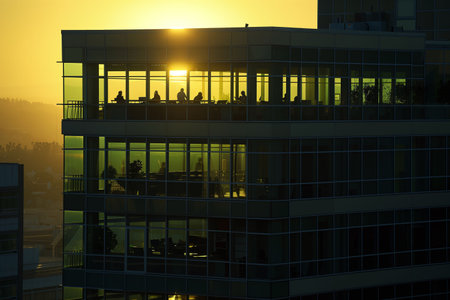 Office building reflecting a vibrant and colorful sunset with employees working late