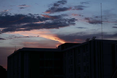 Sunset over the city. Silhouette of the building.