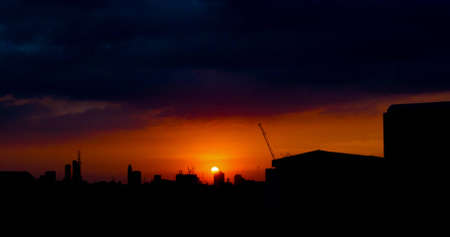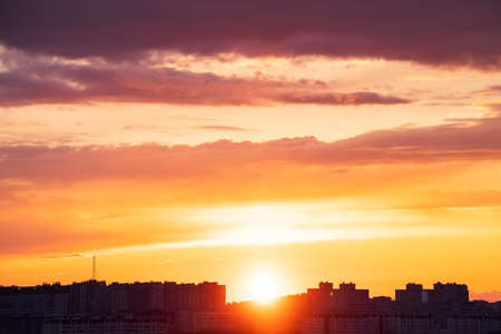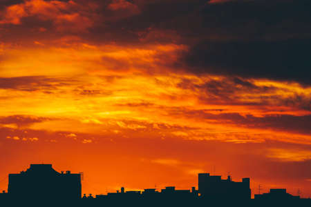Cityscape with vivid fiery dawn. Amazing warm dramatic cloudy sky above dark silhouettes of city buildings. Orange sunlight. Atmospheric background of sunrise in overcast weather. Copy space.