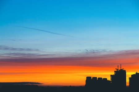 Cityscape with wonderful varicolored vivid dawn. Amazing dramatic blue sky with purple and violet clouds above dark silhouettes of city buildings. Atmospheric background of orange sunrise. Copy space.