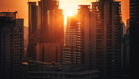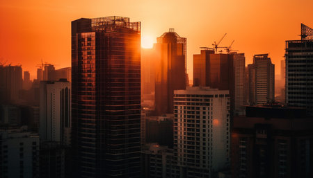Steel skyscraper silhouette reflects sunset in modern financial district panorama generated by artificial intelligence