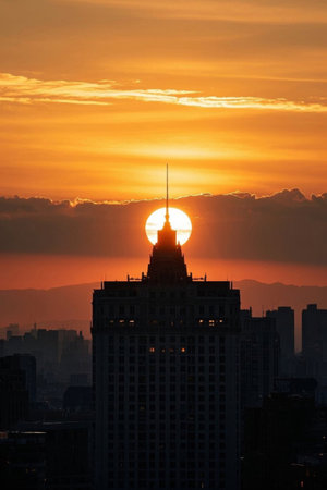 A mesmerizing sunrise over a cityscape, casting a warm glow across the silhouettes of buildings