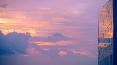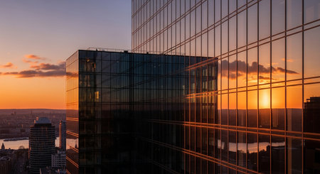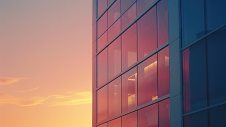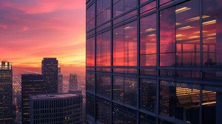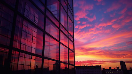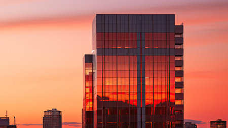 Sunset reflections creating vibrant colors on modern office building facade in corporate hub at dusk