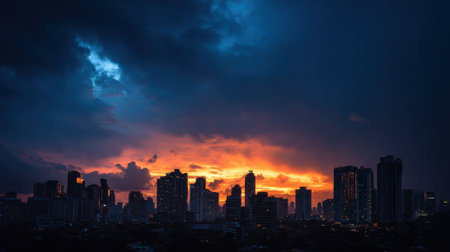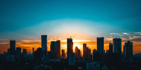 A breathtaking sunset view of a skyline silhouette, with skyscrapers standing tall against a colorful sky, evoking a sense of tranquility and reflection