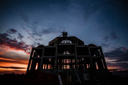 Silhouette of mosque under construction at sunset with cloudy sky