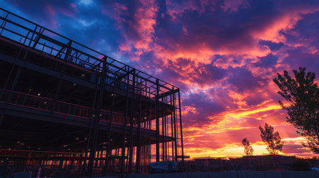 Steel frame office building under construction against a vibrant sunset sky with colorful clouds