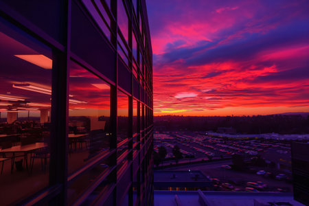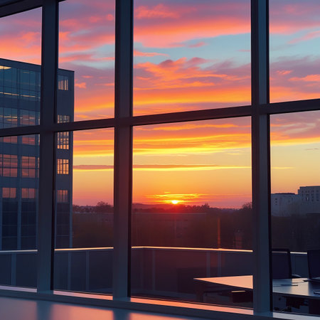 Sunset view from an office window, highlighting the vibrant hues of the sky as the day draws to a close, creating a picturesque backdrop for reflection