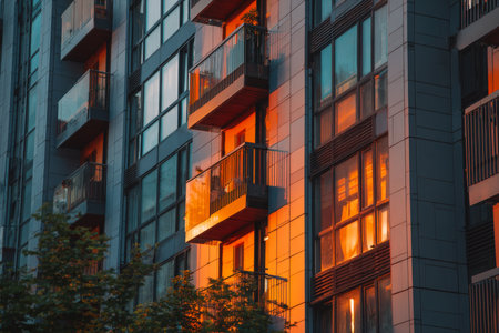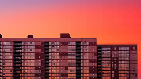 Urban apartments glowing with warm sunset hues, balconies and windows capturing evening light, reflecting tranquil residential landscape against soft twilight sky. buildings reflecting warm colors