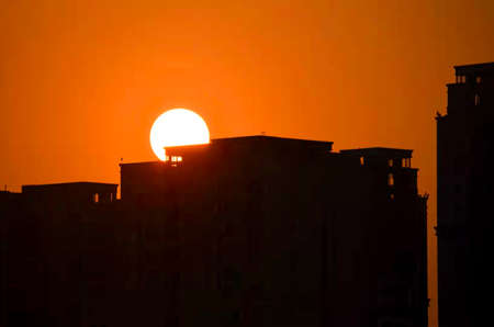 As the sun dips below the horizon, its fiery orange glow bathes the city in warm light.