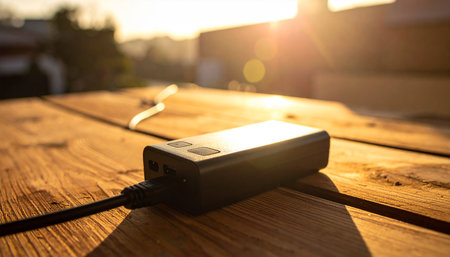 power bank on a wooden table in the rays of the setting sun