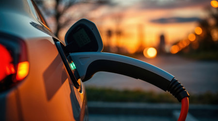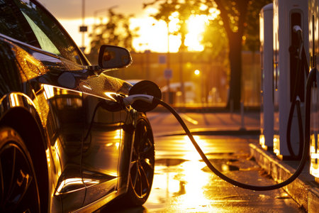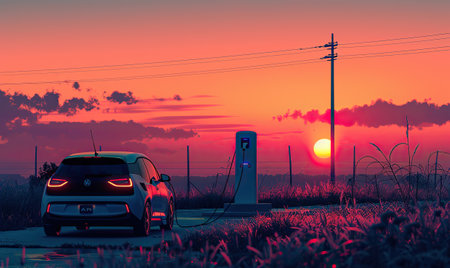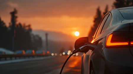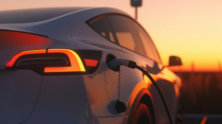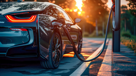 Sunset charging of an electric vehicle with a sleek design, showcasing a sustainable future on a warm summer evening, highlighting technology and eco friendliness