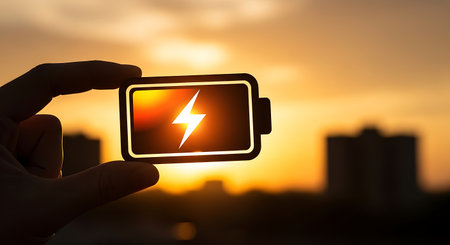 The a hand holding a smartphone with a battery and a lightning symbol displayed on its screen. The background a sunset with an orange sky, creating a warm glow. The city skyline in the distance is silhouetted against the setting sun, adding depth to the scene. The focus is on the smartphone screen, emphasizing the concept of power and energy in a technological context.