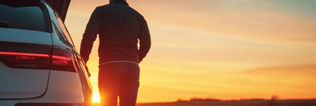 Man walks away from his car at sunset, enjoying the peace and tranquility of the open road, embracing the spirit of adventure and freedom