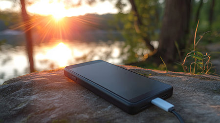 Portable power bank charging a smartphone outdoors, capturing on-the-go convenience and mobility