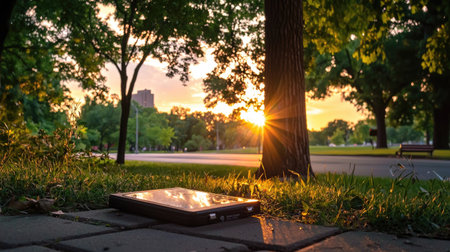 A serene sunset scene featuring a tablet resting on the ground, surrounded by lush greenery, as the sun casts warm light through the trees.