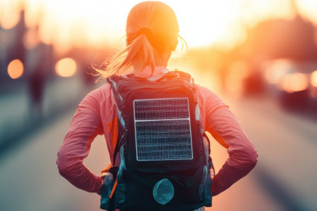 A woman walks through an urban area at sunset, carrying a solar-powered backpack.