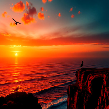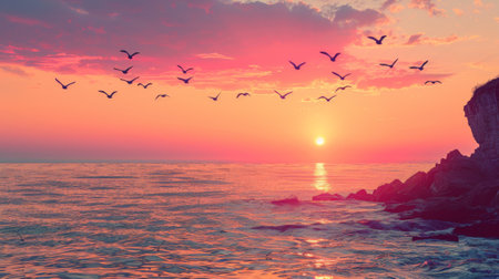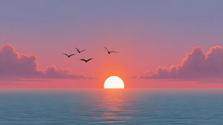 A serene sunset illuminates the tranquil ocean, with birds gracefully flying across a vast sky filled with soft clouds and vibrant colors.