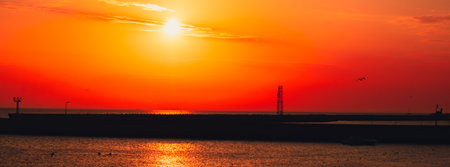 Panoramic view of beautiful sunset with scarlet clouds above the gulf