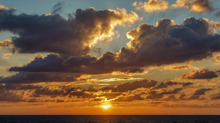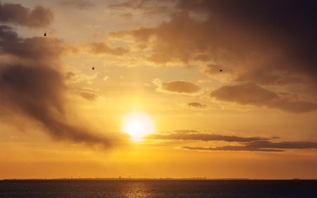 rich bright orange sun in a cloudy sky over the sea during sunset