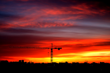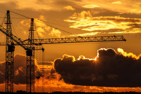 Silhouette of crawler crane arm towering high against sunset sky (background material)
