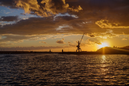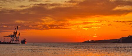 Many big cranes silhouette in the port at golden light of sunrise reflected in water. Berdiansk, Ukraine