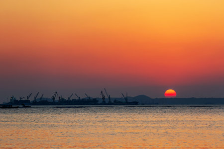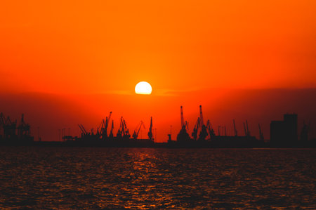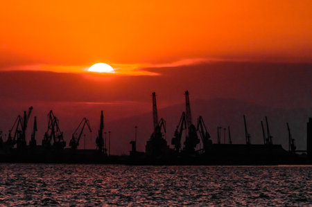 Industrial port cranes silhouetted during sunset in Thessaloniki, Greece, with the sun setting behind orange clouds and the sea reflecting warm colors of the sky.