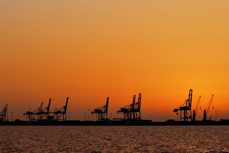 Silhouettes of sea ship cranes on a orange toned warm sunset background.