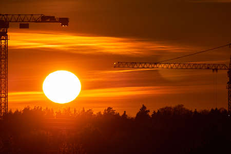 The close-up view of the sunset, the tower cranes in the foreground. The big sun over the forest.