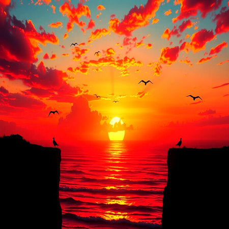 AI Generated. Fiery Sunset Over Calm Ocean Waters Reflecting Vivid Colors