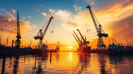 A stunning silhouette of cranes against a vibrant sunset sky. The tranquil harbor scene captures the essence of industry and marine transport.