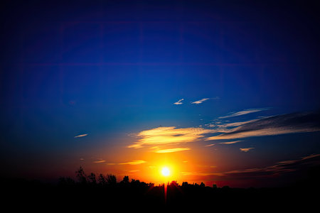 golden sun setting over dark blue sky, created with generative ai
