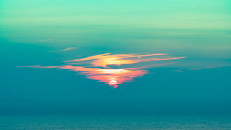 A serene sunset over a calm ocean with vibrant colors in the sky
