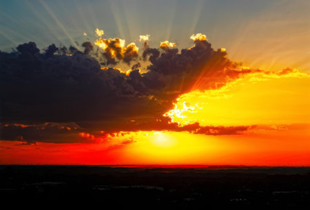 Beautiful dark orange sky evening beauty and Clouds at sunset , dawn, the rays of the sun break through the clouds. Natural background