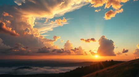 An AI generated illustration of a bright sunset in the horizon over the fluffy clouds