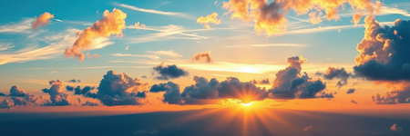 Beautiful sunrise above the clouds and sun. Colorful sky.