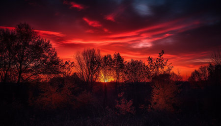 Vibrant sunset silhouettes tree in idyllic rural landscape scenery generated by artificial intelligence