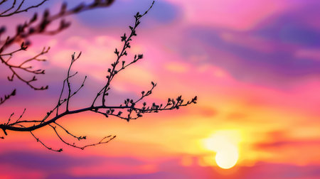 A breathtaking sunset scene featuring silhouetted branches adorned with blossoms against a colorful sky. The soft pastel hues create a tranquil atmosphere, inviting peace and reflection.