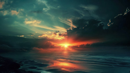 Breathtaking sunset over ocean showcases vibrant hues of orange, pink, and purple, creating serene and tranquil atmosphere. clouds are illuminated by fading sunlight, enhancing beauty of scene