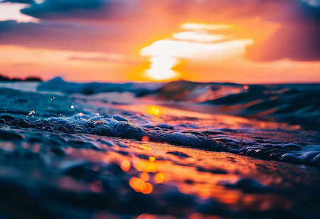 The sun rises over the ocean, casting warm hues across the water. Waves gently roll in, creating bubbles that sparkle in the early light while clouds streak the sky in vibrant colors. Generative AI.