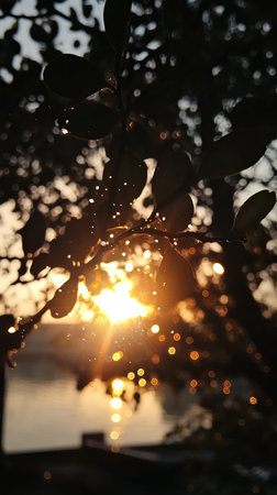 A mesmerizing view of a golden sunset reflecting off a calm water surface, creating a peaceful ambiance with bokeh light effects, symbolizing tranquility.