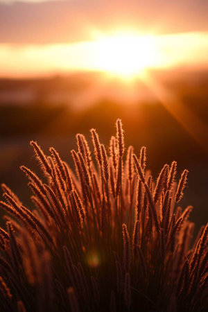 The sun is slowly descending below the horizon, casting a warm golden glow over a vast field of lush green grass. The sky is painted with hues of orange and pink as the day transitions into night.
