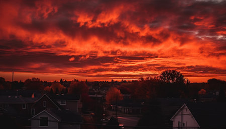 A captivating scene featuring a bright orange sky at sunset, with clouds scattered above a row of houses. The vivid hues of the setting sun create a striking contrast with the rooftops, offering a serene and picturesque view that highlights the beauty of the evening sky over a tranquil neighborhood.