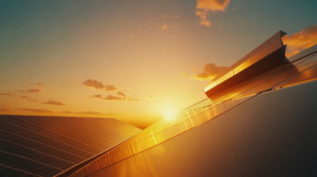 Solar panels reflecting the sunset sky, creating a blend of technology and nature.