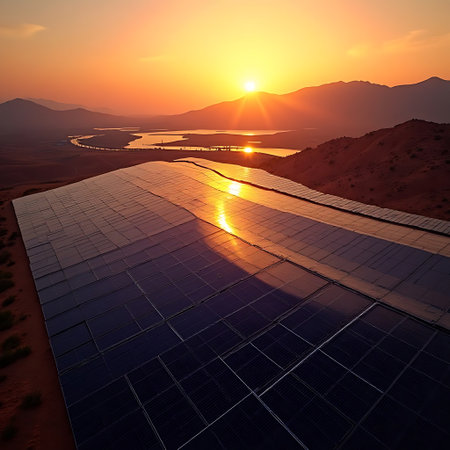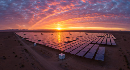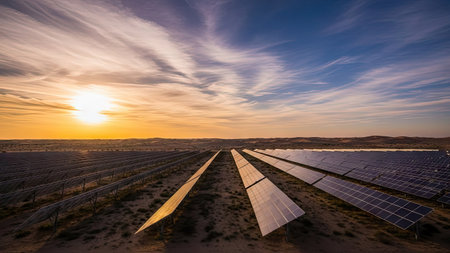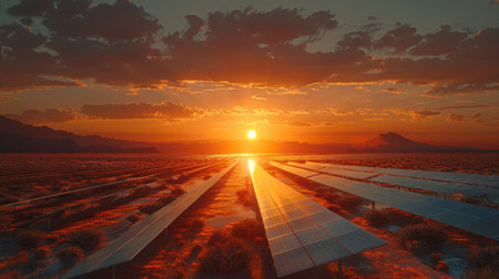 Captivating view of solar panels in a desert setting during a vibrant sunset. The golden sun casts warm light over the landscape, creating a tranquil atmosphere.