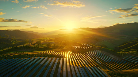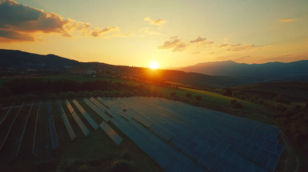 A breathtaking sunset casts a warm glow over solar panels in a serene rural landscape, with distant mountains and vibrant colors reflecting on the panels.