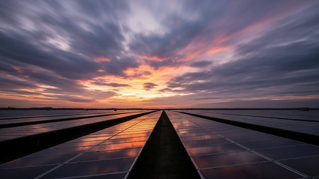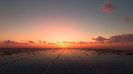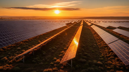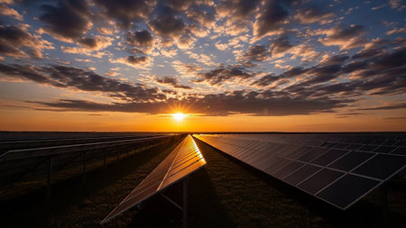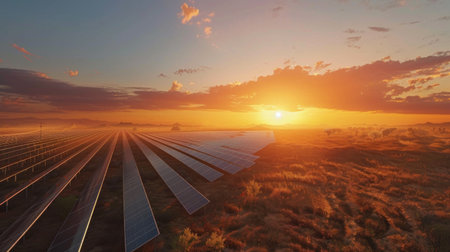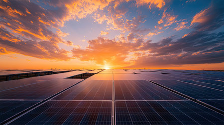 An expansive view showcases rows of solar panels extending towards a vibrant sunset. The composition features a symmetrical arrangement with panels catching the warm hues of the setting sun. The image conveys a sense of environmental responsibility and is suitable for various commercial applications related to renewable energy.